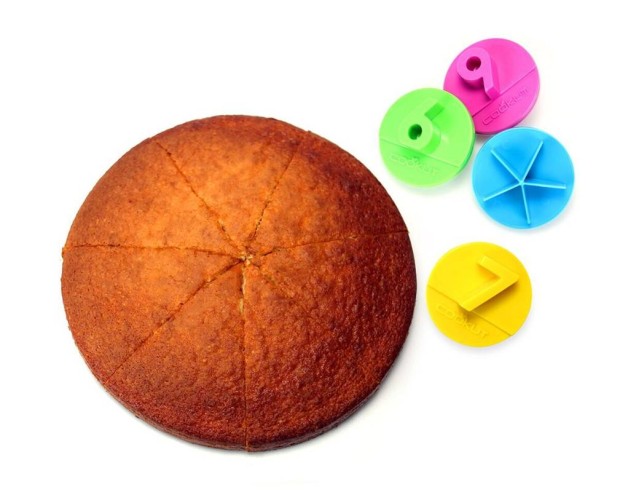 Da li se slažete da skoro nikad ne možemo da isečemo okrugle torte, pizzu ili kolače na potpuno jednake delove? Fabien Dumas je dizajnirao Party merač za pravilno sečenje- super korisnu kuhinjsku alatku. Party je set od 4 merača za pravilno sečenje hrane. Set uključuje merače za sečenje 5, 6, 7 i 9 jednakih parčadi. Vrlo jednostavno se koristi. Potrebno je samo odabrati broj parčadi na koji treba iseći omiljenu poslasticu... i donji deo Party merača ubosti u sredinu. Nakon vađenja merača u sredini torte ostaju urezane linije preko kojih se seče nožem. Na taj način se dobija određen broj identičnih parčadi i ubrzava se proces sečenja. Merači su u 4 različite boje (plava, roze, zelena i žuta). BPA Free. Party merači se mogu prati u mašini.